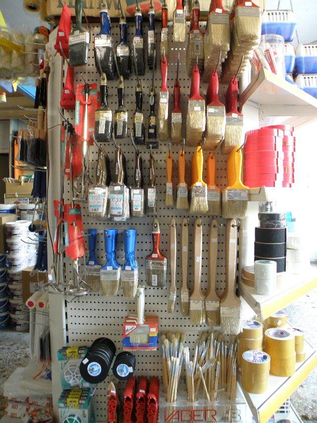 πλαστικά, ακρυλικά, ριπολίνες, ντουκοχρώματα, βερνίκια, αστάρια Οικολογικά χρώματα (πλαστικά, ριπολίνες βερνίκια, αστάρια) Ειδικά χρώματα, κόλλες, μονωτικά, κ. α. Μηχανή χρωματισμού 2000 αποχρώσεων και ανάδευσης χρωμάτων.
