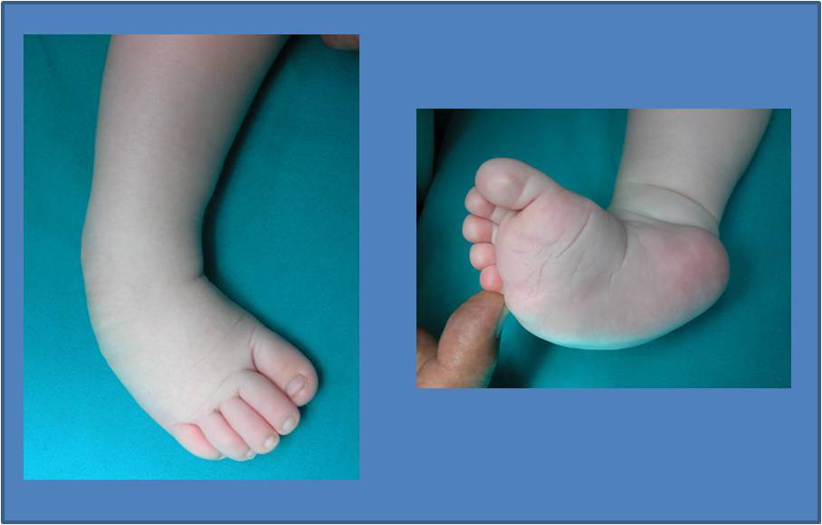 Τα πέλματα των ποδιών που πάσχουν είναι μικρότερα των φυσιολογικών Η πάθηση αφορά το ένα (ετερόπλευρος) ή και τα δύο άκρα (αμφοτερόπλευρος προσβολή). Υπάρχουν δύο κλινικές μορφές της νόσου, η μαλακή και η δύσκαμπτη. Η ταξινόμηση γίνεται ανάλογα με τη δυνατότητά μας να διορθώσομε ή όχι με παθητικές κινήσεις τις παραμορφώσεις. Η θεραπευτική αγωγή της PIΠ αρχίζει αμέσως (τη 2η εβδομάδα) με τη τοποθέτηση διορθωτικών γύψινων επιδέσμων και συνεχίζεται για 3-4 μήνες Αν παραμείνουν οι παραμορφώσεις διορθώνονται χειρουργικά μετά τον 5ο – 6ο μήνα .Οι προσπάθειές μας για την αποκατάσταση του ποδιού πρέπει να περατωθούν μέχρι το 12ο μήνα. Όταν αρχίζει να βαδίζει το παιδί (12ος – 13ος μήνας) η τυχόν φόρτιση ενός μη φυσιολογικού ποδιού προκαλεί μόνιμες εκφυλιστικές αλλοιώσεις στις αρθρώσεις του. Η διαδοχική εφαρμογή των γύψινων επιδέσμων (μηροποδοκνημικών) οι οποίοι αλλάζουν κάθε εβδομάδα και διορθώνουν προοδευτικά τις παραμορφώσεις